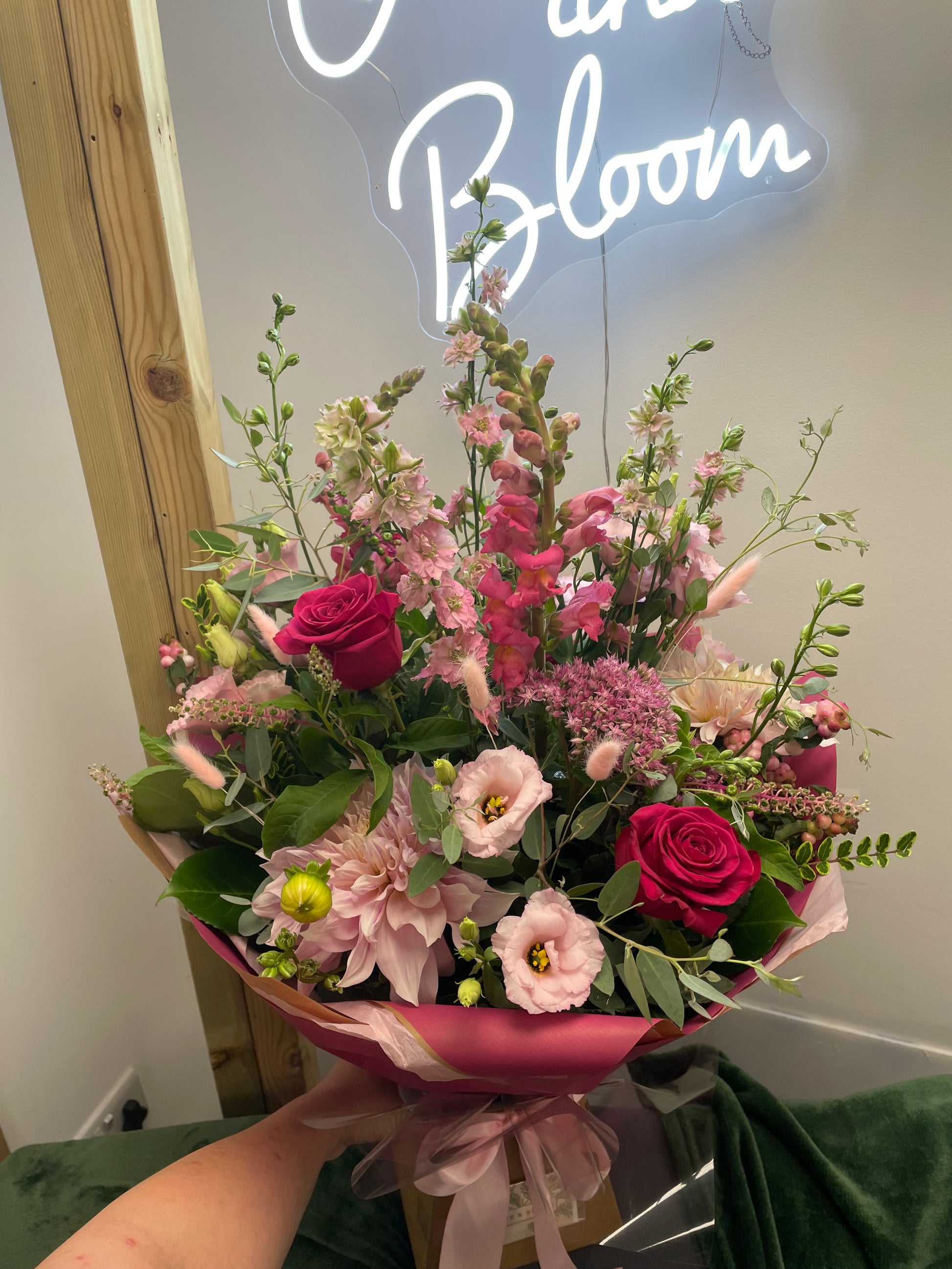 A beautiful handtied aqua bouquet of all pink shades using blush dahlias, hot pink roses, pale pink lisianthus and seasonal blooms with mixed green foliages gift wrapped with pink paper and tissue with a biodegradable cello water reservoir in a box dressed with a bow.