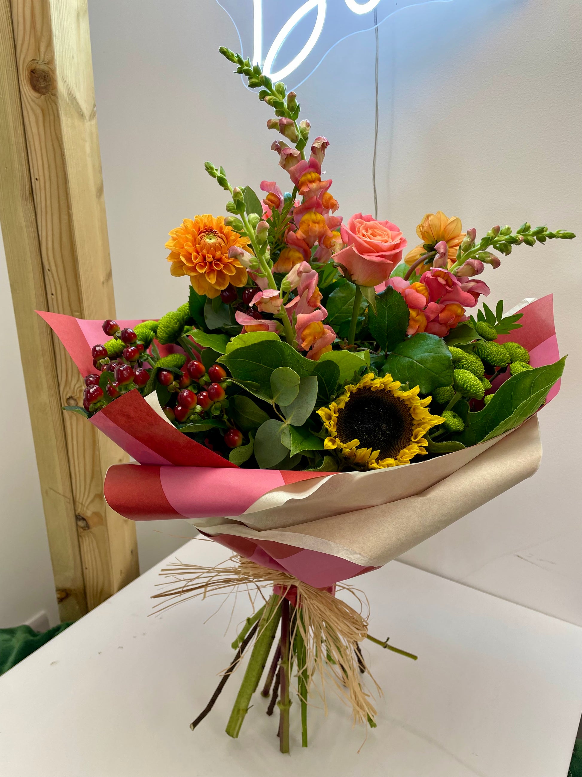 Learn how to arrange a handtied bouquet of scrumptious autumnal blooms using the spiral technique for a perfect all round arrangement displayed in a vase.