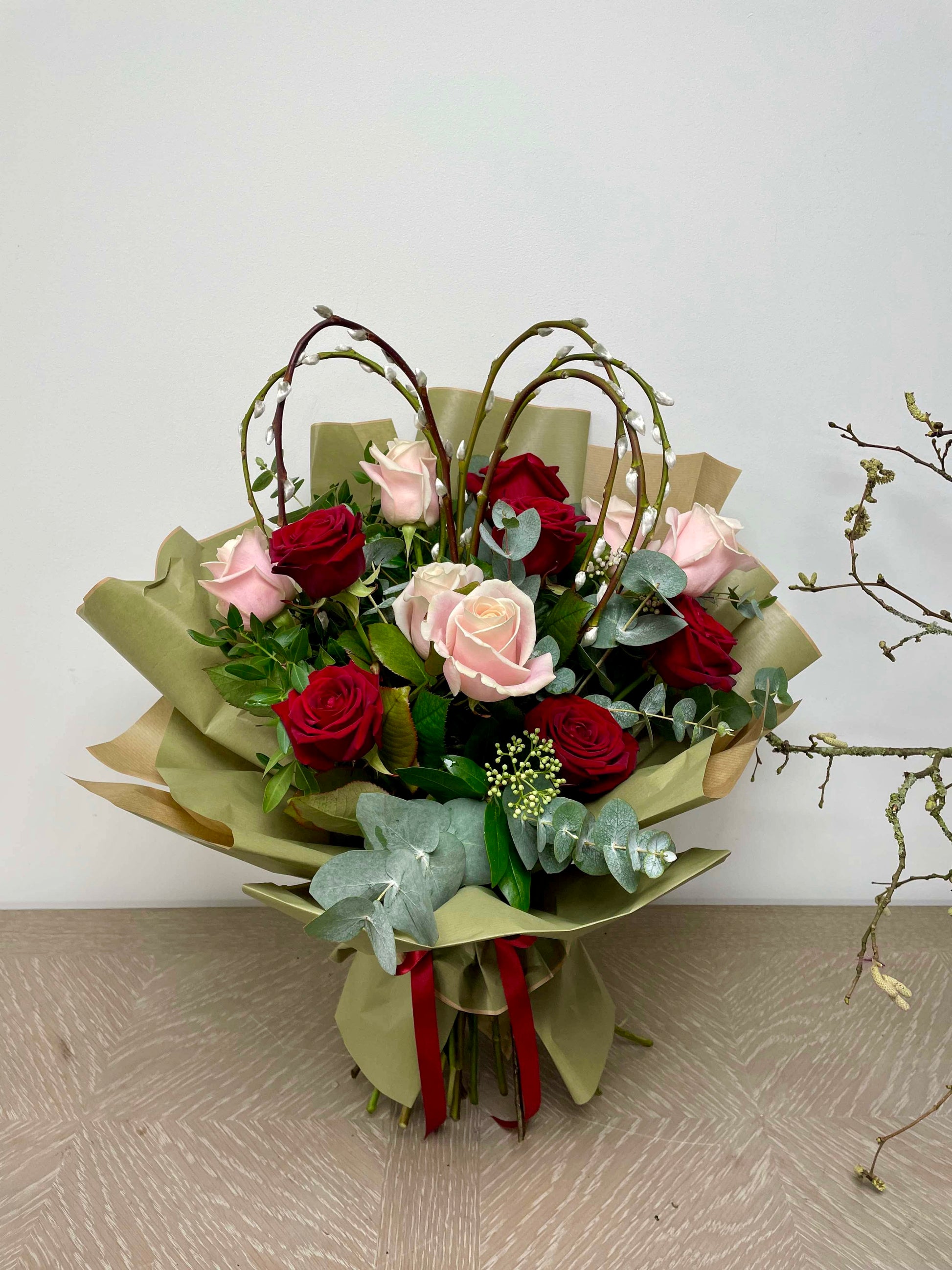 expertly handtied using six glorious 60cm sweet avalanche roses, six 60cm velvet red Naomi roses, willow heart and lashings of eucalyptus and mixed foliage, gift wrapped in biodegradable paper wrap and finished with a signature satin bow.