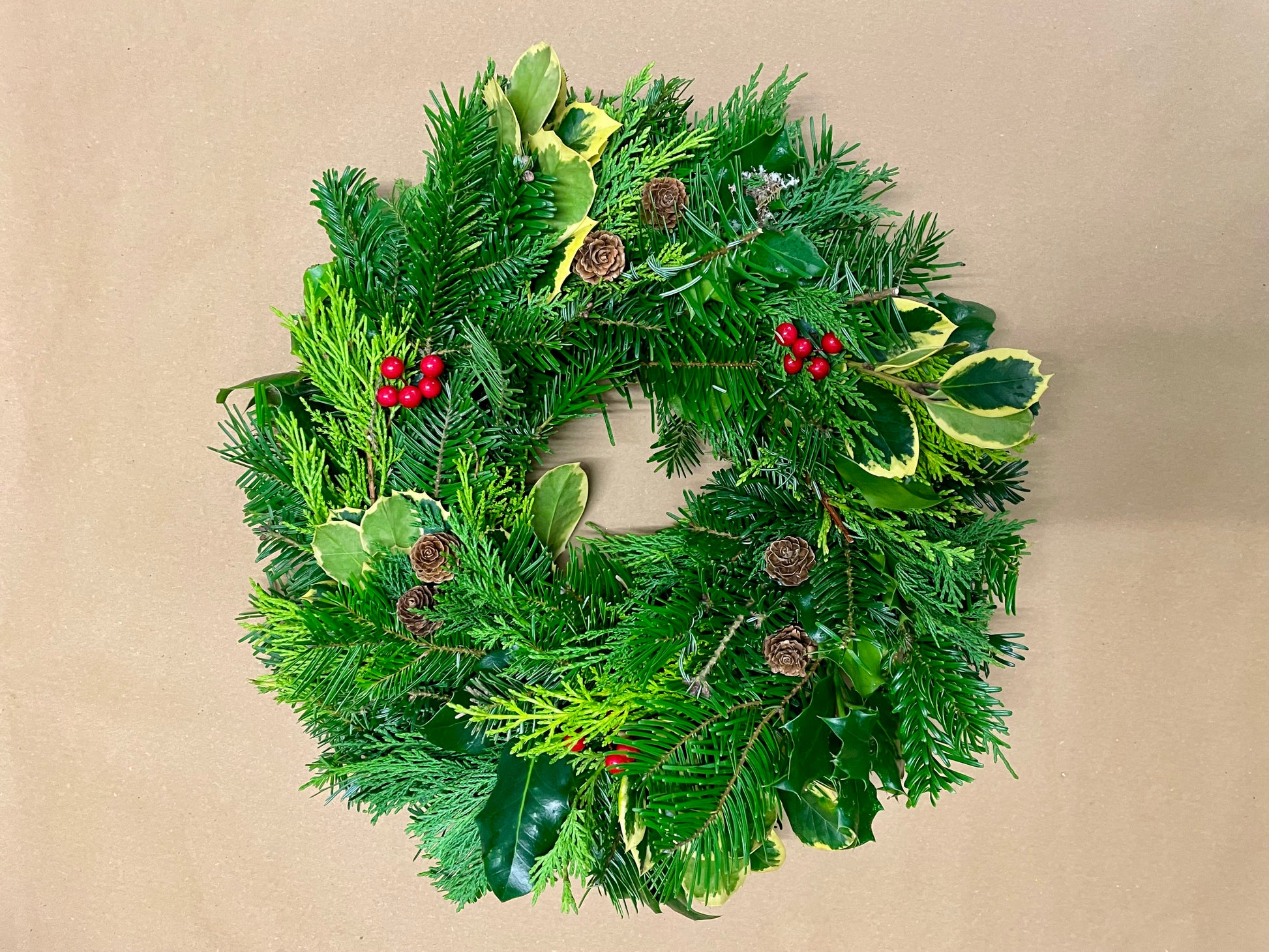 A handmade mixed winter foliage wreath on a metal frame using spruce, Leylandii, ivy and holly, dressed with artificial berries and little larch cones for a natural look. Perfect for a loved ones grave this Christmas.