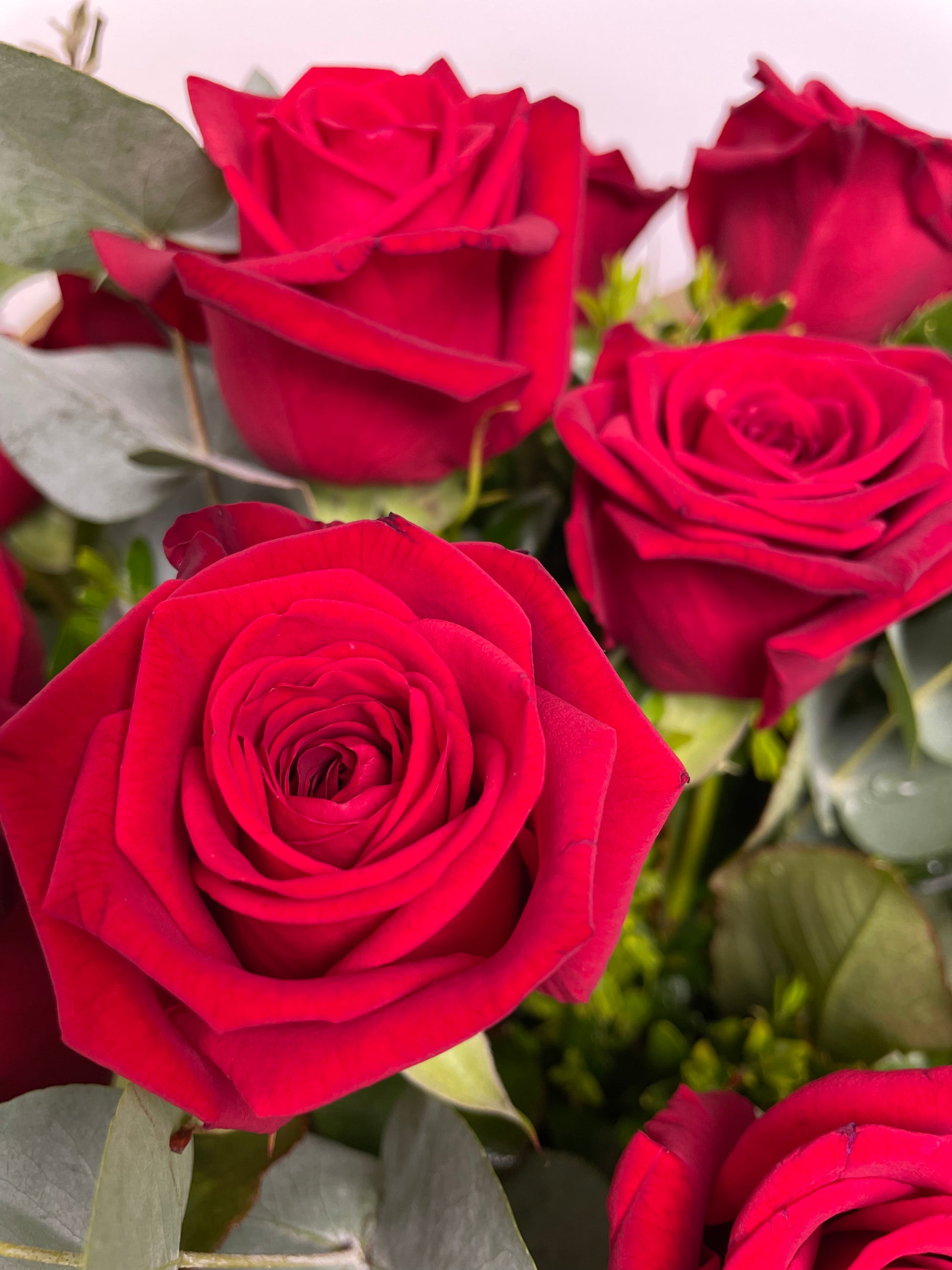 A stunning handtied aqua bouquet of 12, 18 or 24 luxury 60cm velvet red Naomi roses paired with mixed green foliages and gift wrapped using biodegradable wrapping, water bubble and box finished with a signature satin ribbon. A perfect treat this valentines!